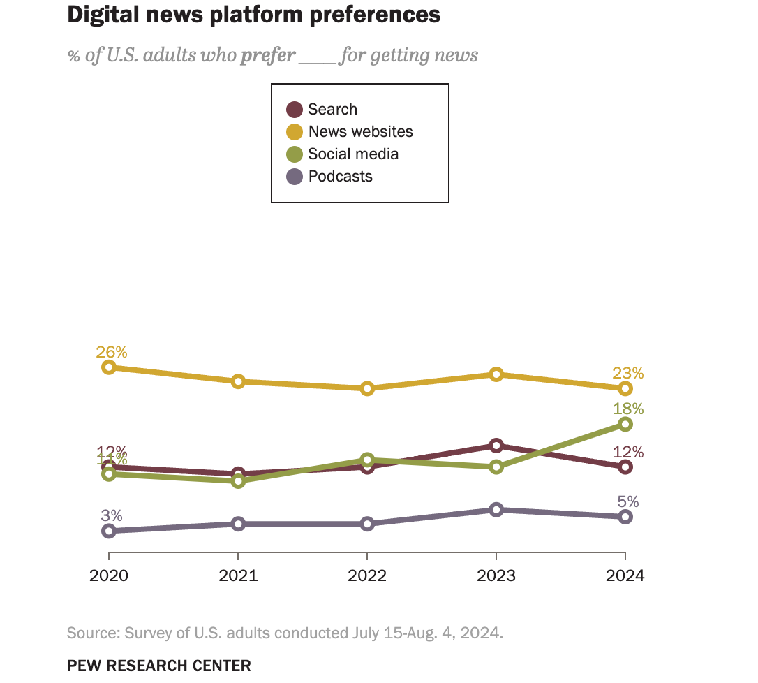 These data trends coincide with the direction that news production and news consumption is naturally moving toward. Younger audiences are turning to social video more and more for news than traditional cable or broadcast television stations. Nearly 60% of adults in the U.S. prefer getting their news from digital devices compared to the 32% who prefer television broadcasts, according to Pew’s September media habits report. Not to mention that news delivered via a news publication via digital distribution decreased from 25% to 22% between 2023 and 2024 amongst adults in the U.S. compared to social media, which increased from 12% to 18%.